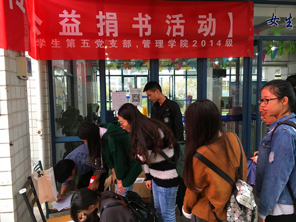 学院对此活动也极其重视,学院副书记邓艳华老师组织师生积极配合第五党支部的工作,亲临活动现场并予以高度评价,赠人玫瑰,手留余香,并倡议即将毕业的2013级学生开展“感恩母校,书馨相传”活动,将自己的书籍捐赠出来,让旧书新用,书尽其用。她希望公益捐书活动作为学院的传统项目,能够传承下去,服务每一代的柚子。她还强调管理学院师生同心同德,集思广益,开创、延续更多富有意义的活动,让管院学子受益良多,让学院由内而外焕发生机。