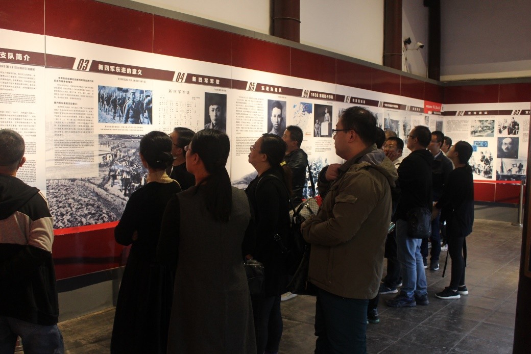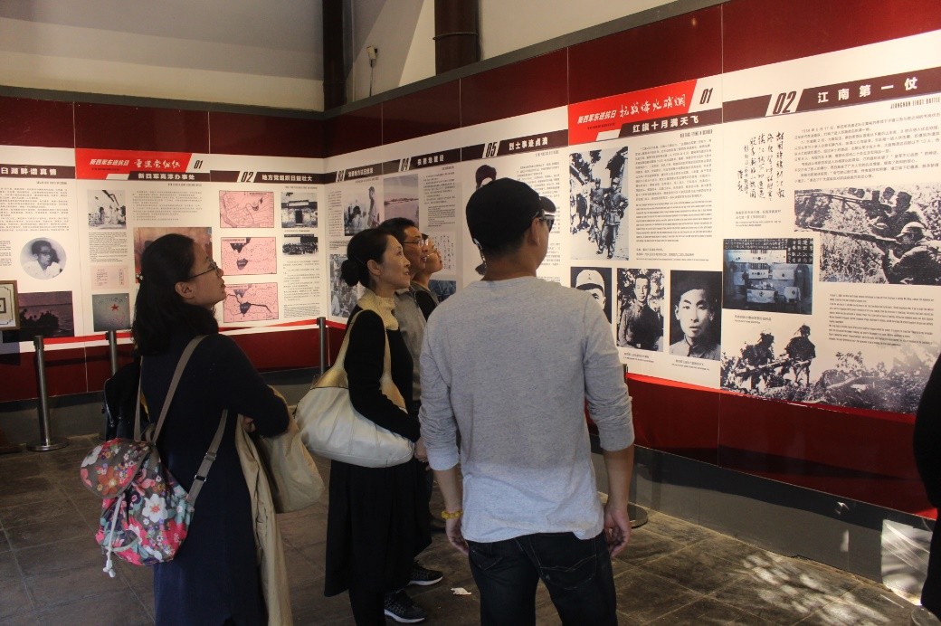 高淳新四军纪念馆位于高淳老街。抗日战争时期,陈毅司令于1938年6月亲率新四军一支队东征进驻高淳时,曾在位于老街中段的"吴氏宗祠"内设立了新四军一支队司令部。党员们在总支书记刘蒙的带领下,首先参观了新四军一支队司令部旧址。整个纪念馆,从“陈毅初抵高淳,铁军东进苏南”、“发动群众抗日”、“溧高捷报频传,军民并肩抗战”、“辗转山区,留下永久佳话”四个方面,以大量的老照片、文献资料、图文解说及实物,重现了当年新四军和苏南人民浴血奋战的经过和历史。展板上一幅幅珍贵的照片、一篇篇详实的史料让大家的思绪又回到了战火纷飞的抗战年代,让全体党员们重温了中国共产党领导人民取得抗战胜利的光辉曲折历程。陈毅元帅诗作《东征初抵高淳》中的“扁舟容与人如画,抗战军中味太平”、“兵船初过疑群寇,及见亲人笑语哗”、“步哨惊觉征人起,欣然夜半到高淳”更是让大家体会到了当时战争的紧张气氛,以及革命战士和群众的鱼水之情。随后,党员们又来到了新四军驻高淳办事处旧址,参观了当时艰苦的办公条件和严酷的战争场景。
