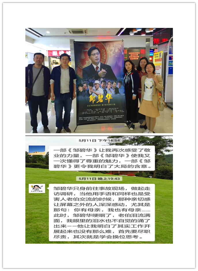 随后,支部全体成员奔赴影院观看了公正为民的好法官,敢于担当的好干部邹碧华生前事迹改编的电影《邹碧华》。影片以倒叙回忆的形式,从同事、亲人的不同视角,多维度、多侧面重现了邹碧华的感人事迹。从微小细节刻画中使观众深刻感受到一名好党员、好干部、好法官长期扎根人民法院工作,这位“庭前独角兽”始终坚持司法为民、公正司法,敢啃“硬骨头”,甘当“燃灯者”的崇高精神。观影后,大家在支部学习微信群中进行讨论,纷纷表示,要以邹碧华为榜样,甘当“燃灯者”,坚守共产党人的精神追求,做信仰的坚守者、传递者、守护者。