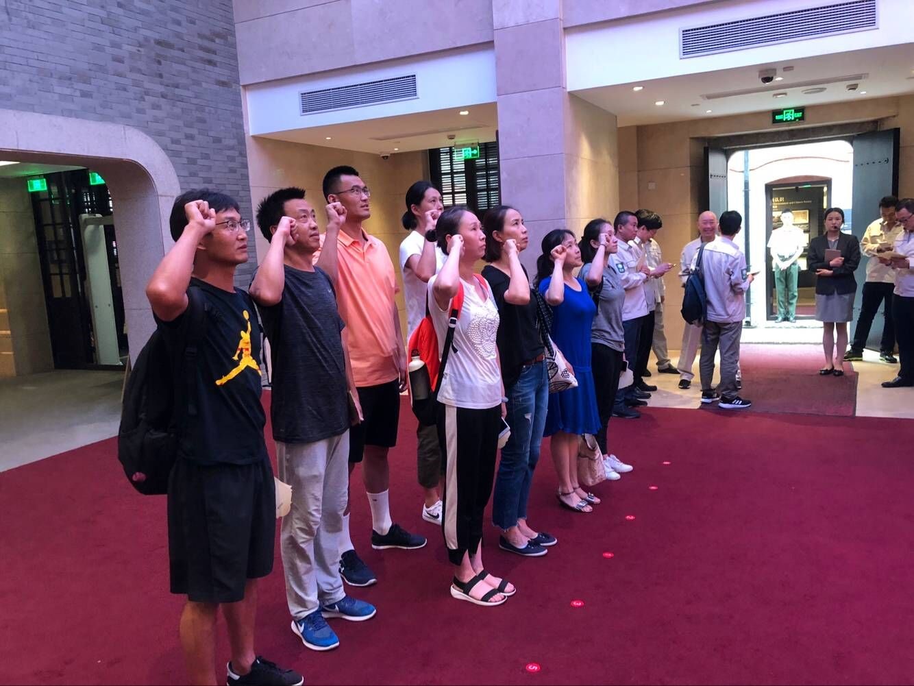参观结束时,大家纷纷表示,党的十九大把习近平新时代中国特色社会主义思想写入党章,确立为党的行动指南。我们要用这一重要思想武装头脑、指导实践、推动工作。作为共产党员,必须以党章为根本遵循,约束规范自己的一言一行。