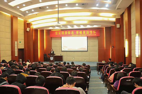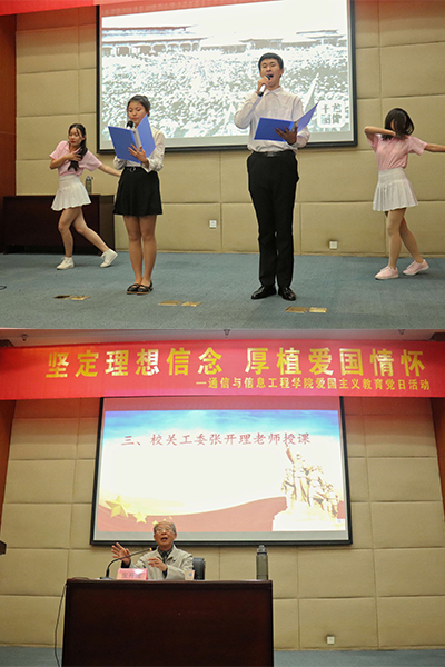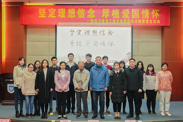 为积极响应和落实习近平总书记全国教育大会重要讲话精神, 11月21日下午,通信与信息工程学院在行政楼一楼报告厅举办了以“坚定理想信念,厚植爱国情怀”为主题的爱国主义教育党日活动,这也是学院“六个‘下功夫’培养时代新人”系列主题教育活动的一个子活动。校关工委张开理老师、通信学院党委李飞书记、高志华副书记,学院2017级辅导员林雨纯老师、周宇老师以及2017级通院学生们参加了本次活动。
