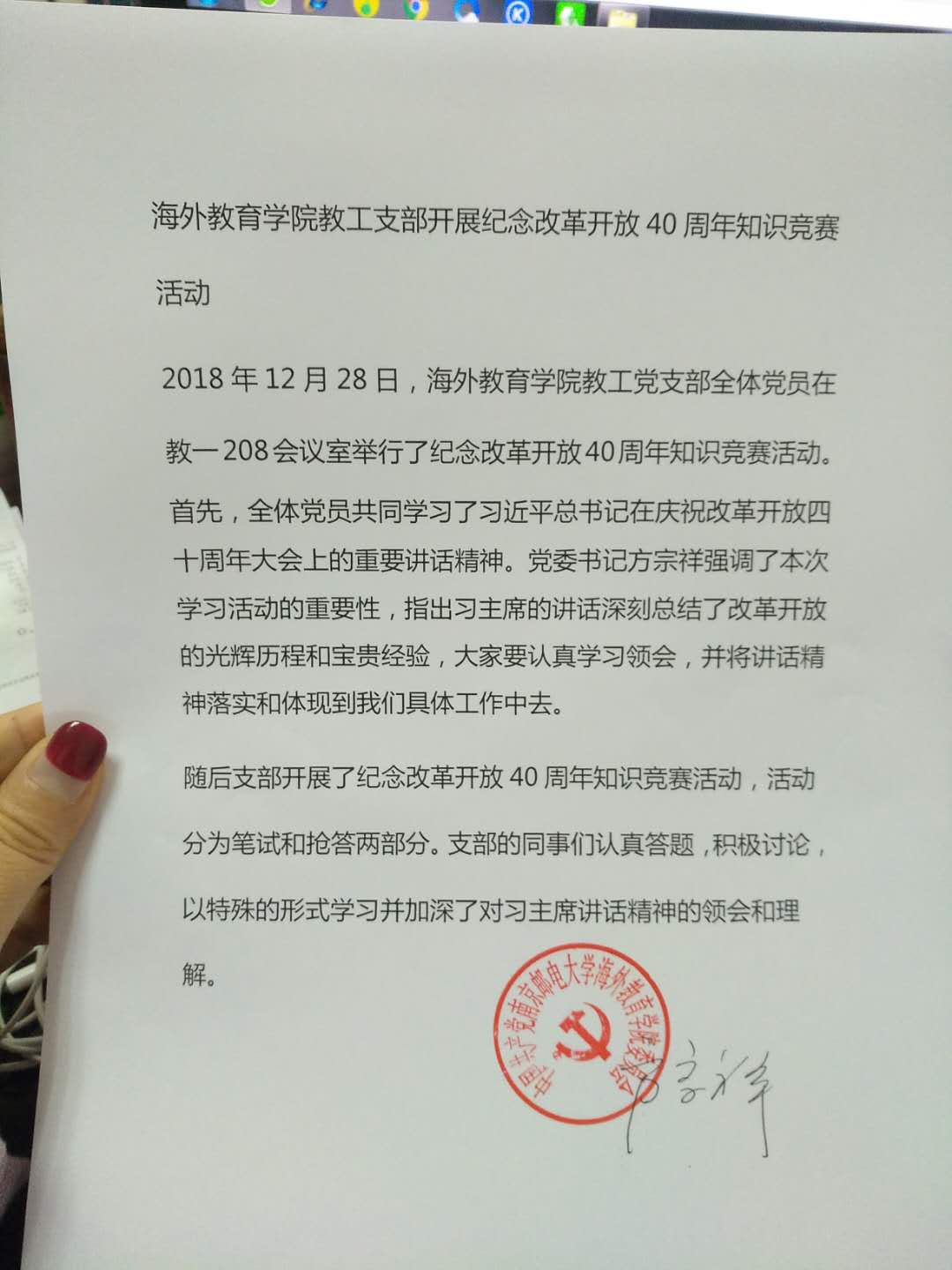 2018年12月28日,海外教育学院教工党支部全体党员在教一208会议室举行了纪念改革开放40周年知识竞赛活动。