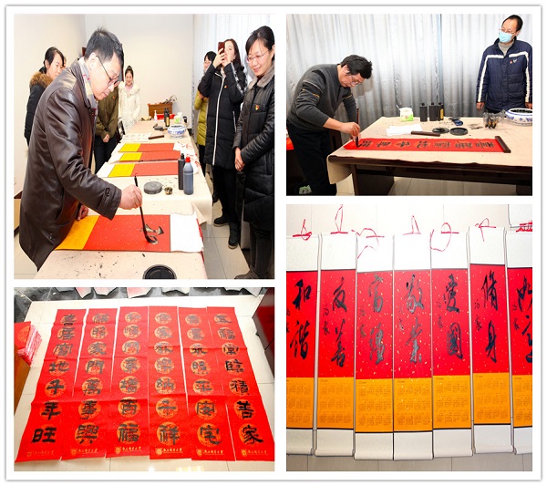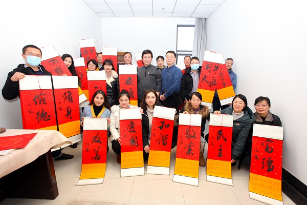 1月13日下午,各支部书记、党员代表及部分群众来到仙林图书馆207室参加党日活动。活动现场,图书馆、档案馆党总支书记钱军老师和第一支部党员冯震老师一同书写社会主义核心价值观、中华传统美德、新年祝福语等内容。两位老师挥毫泼墨, “爱国”“富强”“敬业”“和谐”“友善”“修身”“俭德”等一幅幅形式多样、笔法各异的卷轴年历、春联等书法作品相继呈现。书法作品或正或草或隶或篆,以不同的艺术表现形式,多角度、全方面诠释了社会主义核心价值观和廉政文化的生动内涵,两位老师在书写的过程中,大家一起交流探讨社会主义核心价值观的要义。广大党员和群众不仅受到了艺术熏陶,而且接受了廉政教育洗礼,更坚定了“立德树人、服务育人”的理想信念。